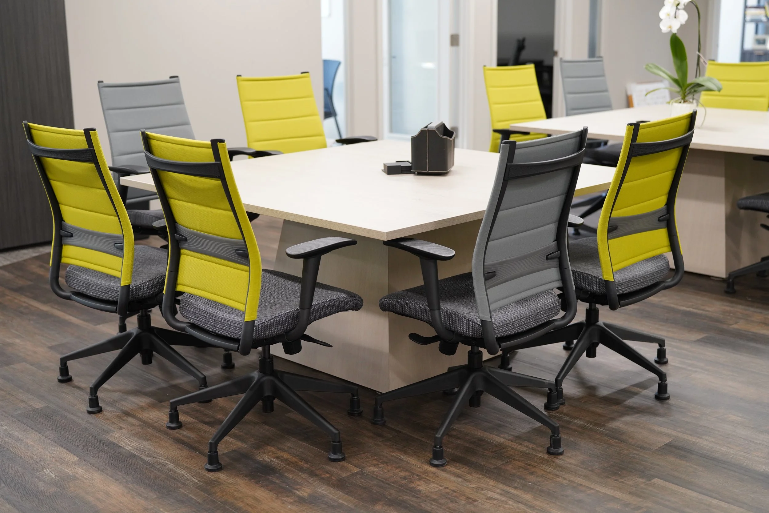 At the heart of the design are bold, custom-base tables—crafted to adapt to the team’s varied needs. Whether used for lunch, collaborative work, or combined to form a large conference table, these tables offer flexibility and functionality.