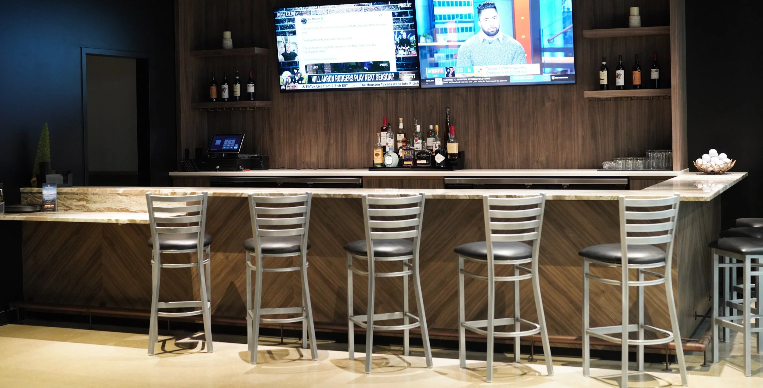 We designed a custom L-shaped reception desk with an integrated screen for branding, alongside a fully refreshed bar featuring coordinated finishes, built-in storage, and display shelving. Each element was carefully selected to balance style and function, resulting in a cohesive space that warmly welcomes guests and elevates their overall experience.